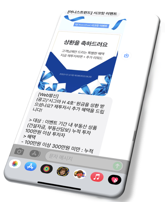 어니스트펀드에는 사실 시크릿 이벤트가 존재해요. 상환 받은 투자자들에게 상환 축하 이벤트와 함께 투자 포인트를 드리고 있어요. 다만 이벤트라 광고성으로 분류가 되어 수신 동의를 하지 않은 투자자들에게는 아쉽게도 시크릿 이벤트 안내 문자를 보내드릴 수 없었습니다.