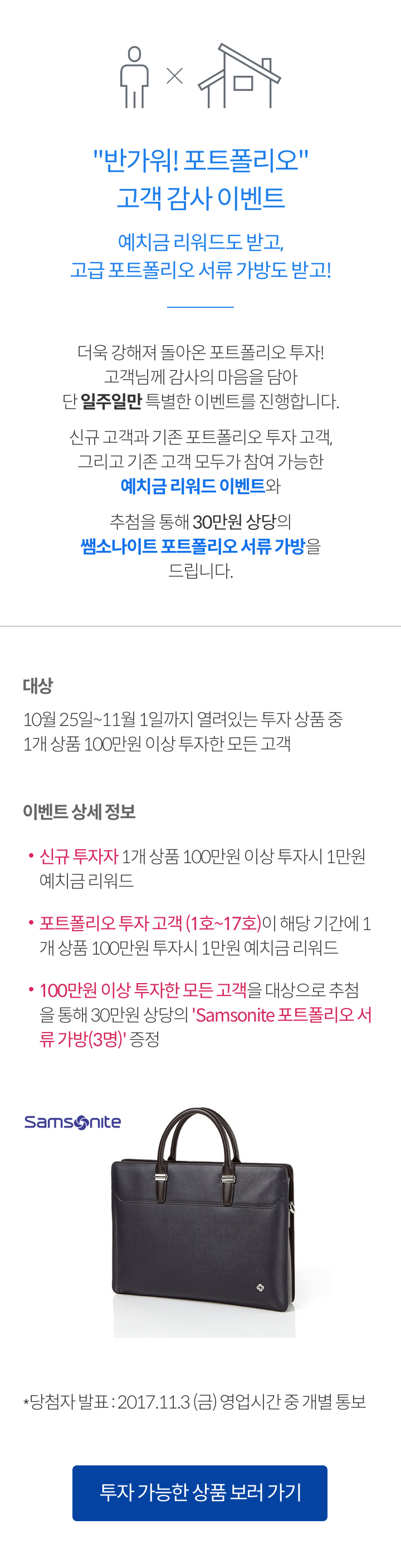 이벤트 기간 1개 상품 100만원 이상 투자한 신규 투자자와 기존 포트폴리오 투자자(1호~17호)