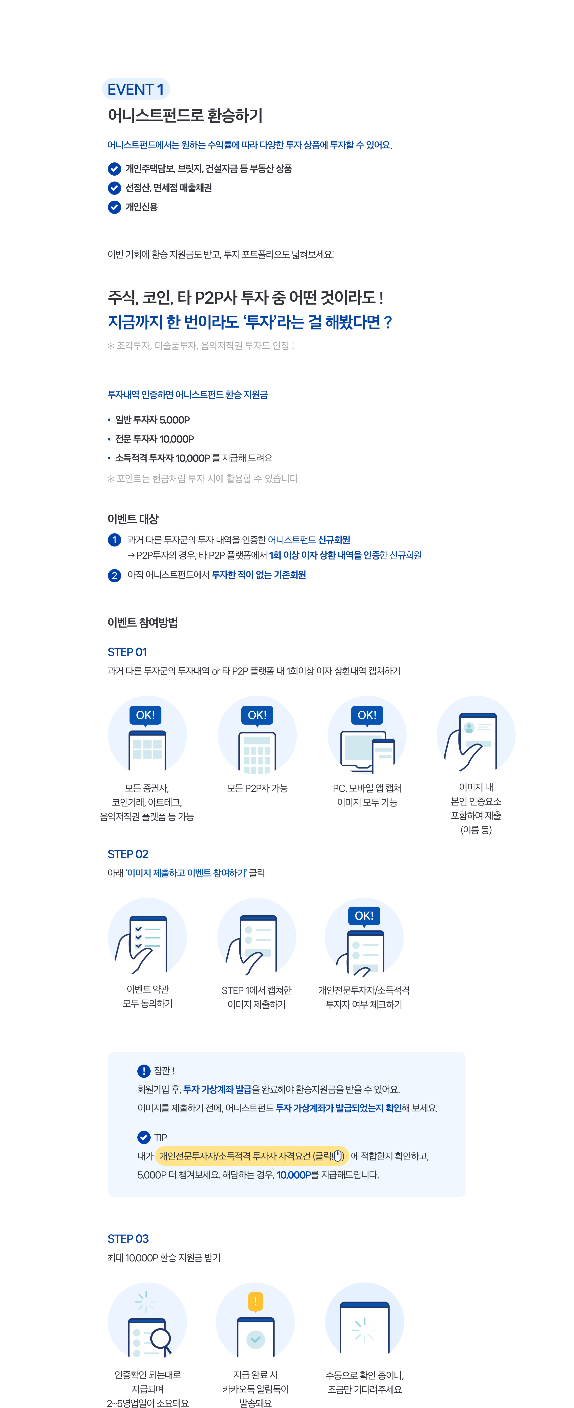 - 개인전문투자자/소득적격 투자자 여부에 체크시, 전환자격 승인이 완료 되었을 때 10,000P를 지급해 드립니다.