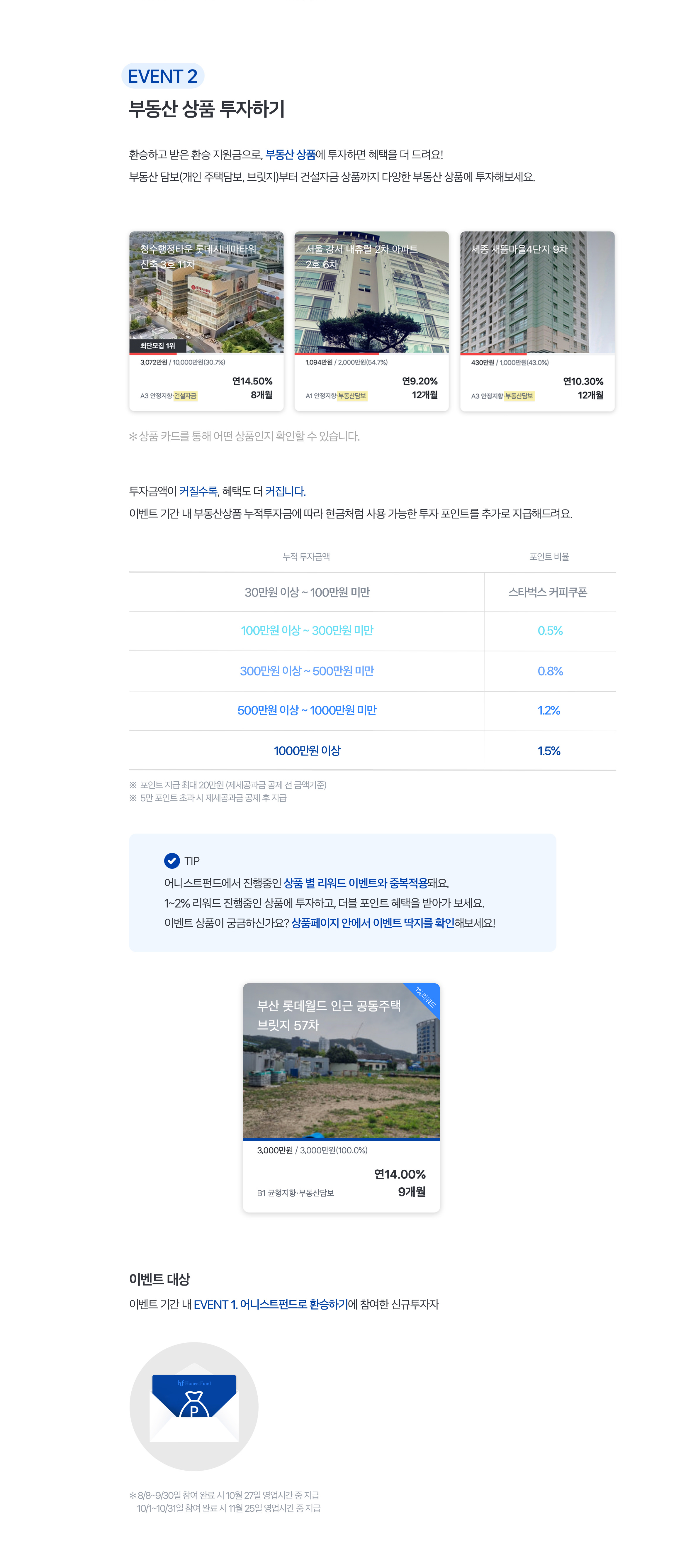 - 이벤트 대상은 신규회원이며, 가입이력이 있으나 투자이력이 없는 기존회원도 포함합니다.