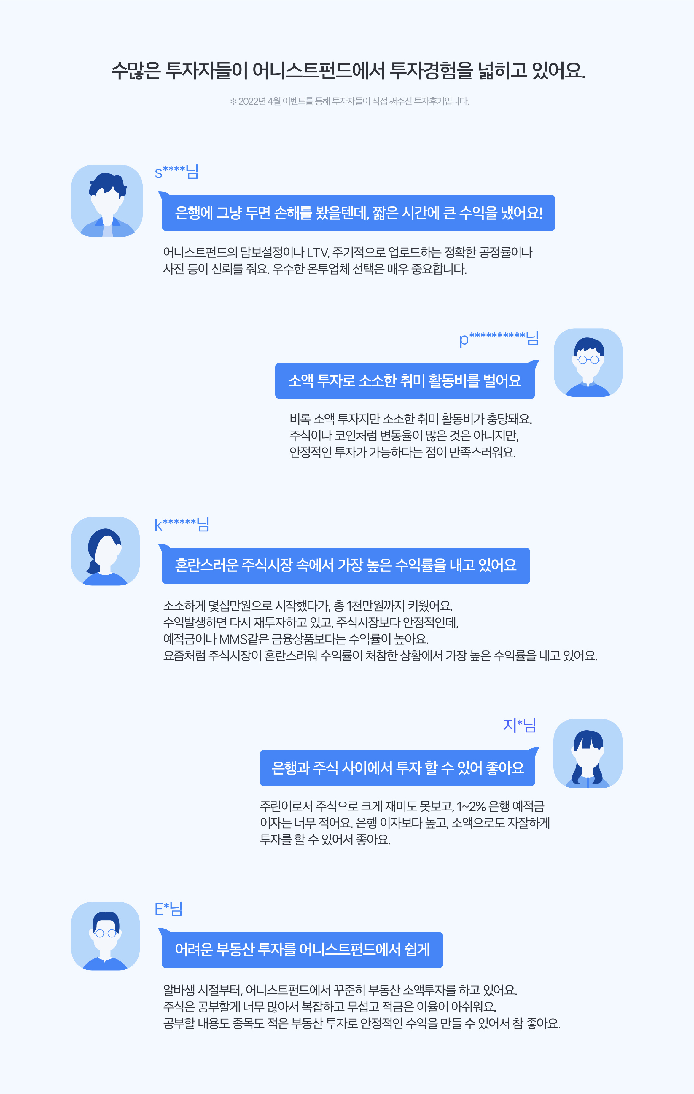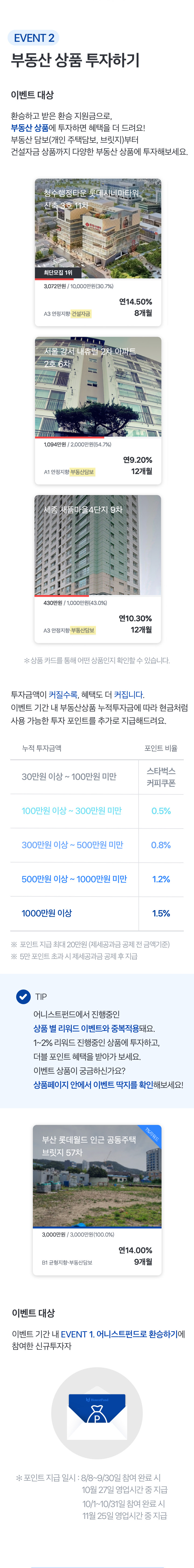 - 포인트 수령을 목적으로 한 투자취소 행위 등 비정상적 투자 행위가 적발될 경우, 해당 회원의 투자 활동에 제재를 가할 수 있고 리워드 지급 중지, 포인트 회수, 추후 이벤트 참여 제외 등의 불이익이 있을 수 있습니다.