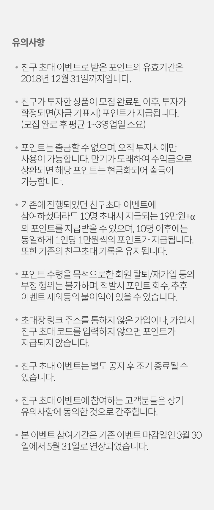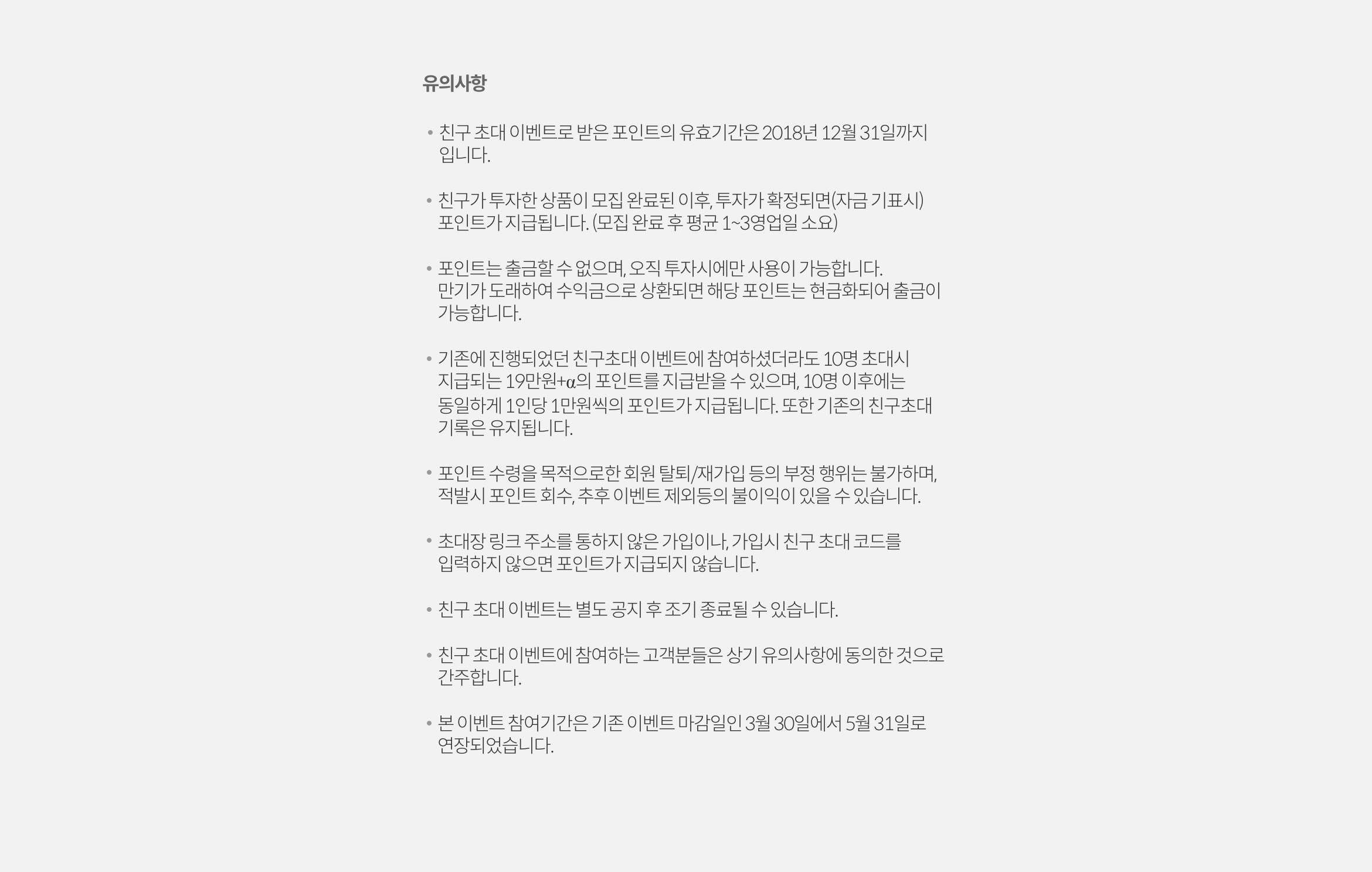 이벤트 어니스트펀드에 친구를 초대하고 19만원+α 투자지원금 받아가세요 2018.02.20 ~ 2018.05.31 내 초대장 보내러 가기 내 초대장 보내러 가기 다음 최대 1.5% 포인트 어니스트펀드 봄맞이 이벤트 안내 2018.02.22 ~ 2018.03.12 이전 2월 #이제나도투자자 투자후기 공유 이벤트 당첨자 발표 2018.02.28 ~ 2019.06.18 목록 이벤트가 종료되었습니다. 확인