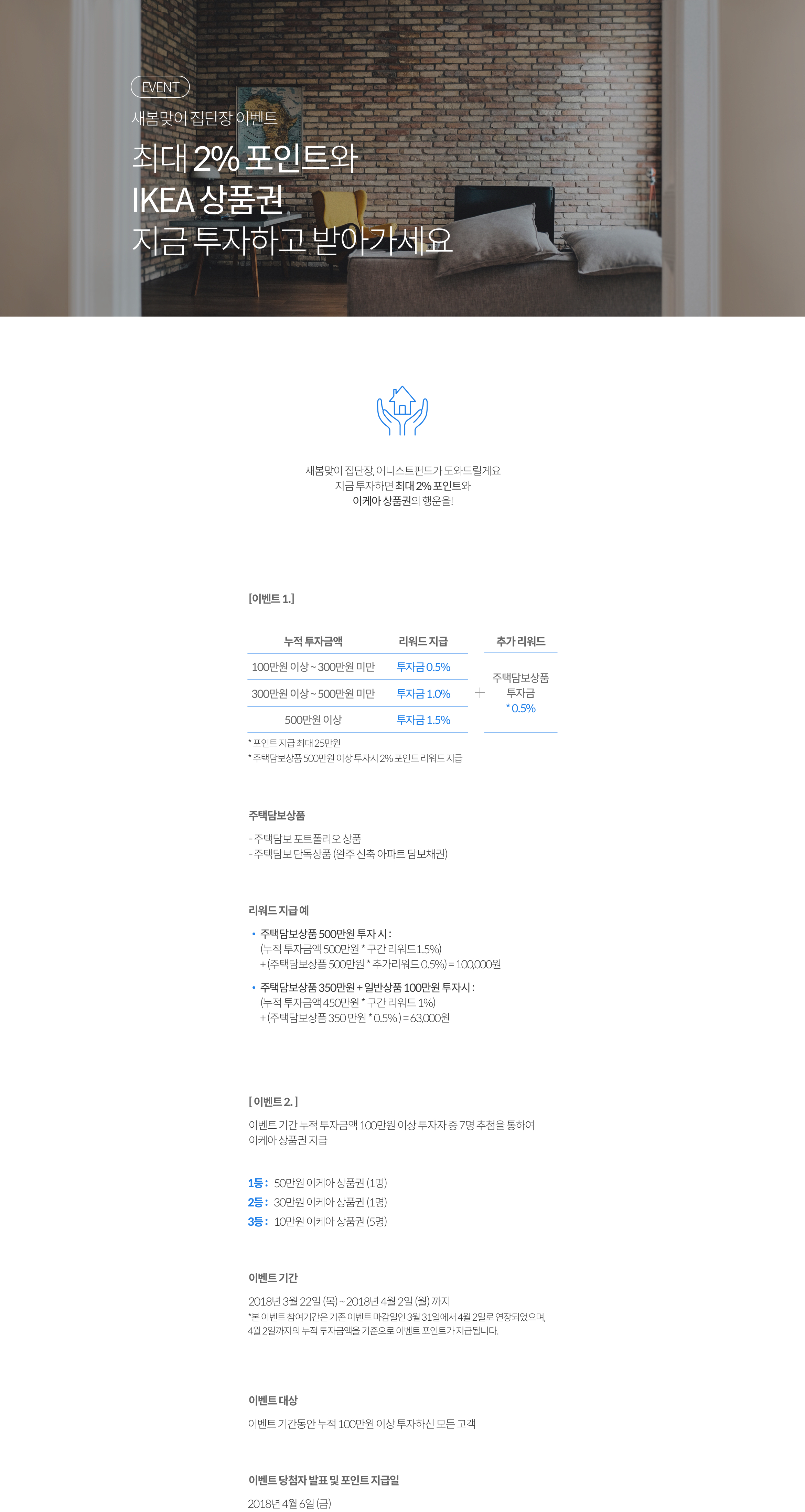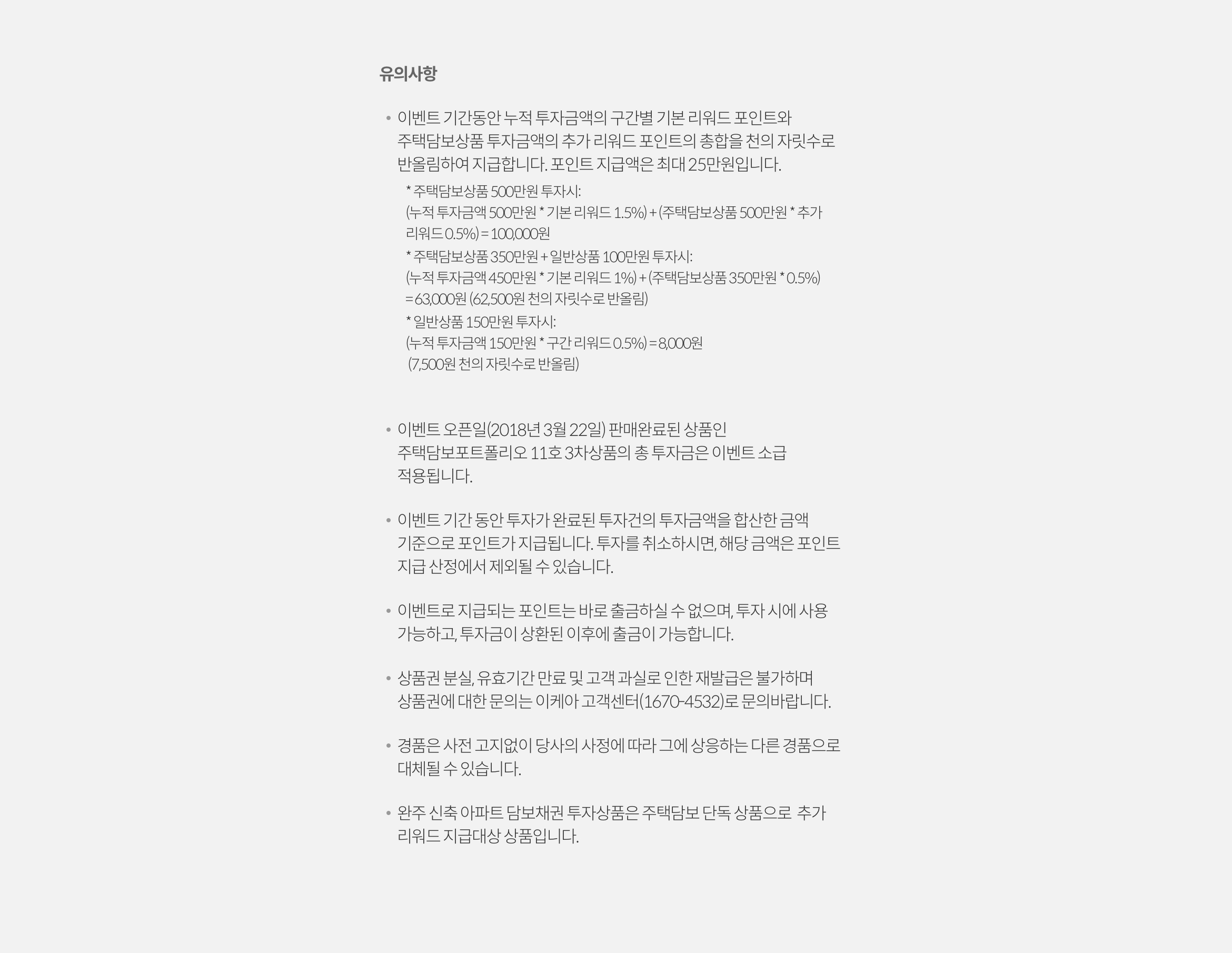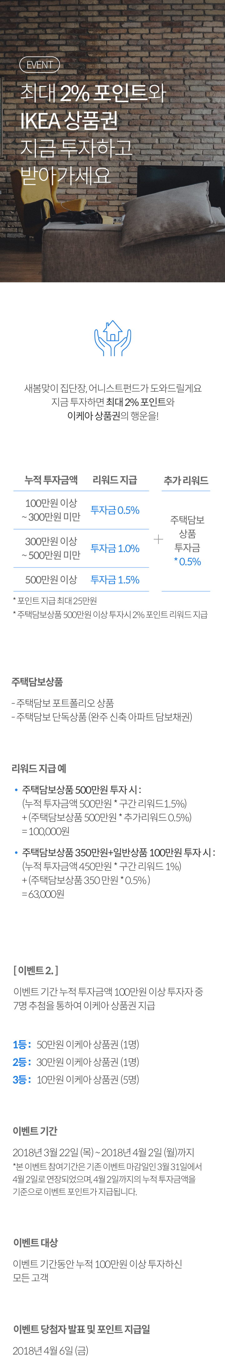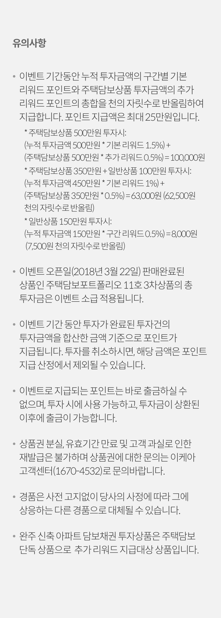 - 이벤트 오픈일(2018년 3월 22일) 판매완료된 상품인 주택담보포트폴리오 11호 3차상품의 총 투자금은 이벤트 소급 적용됩니다.