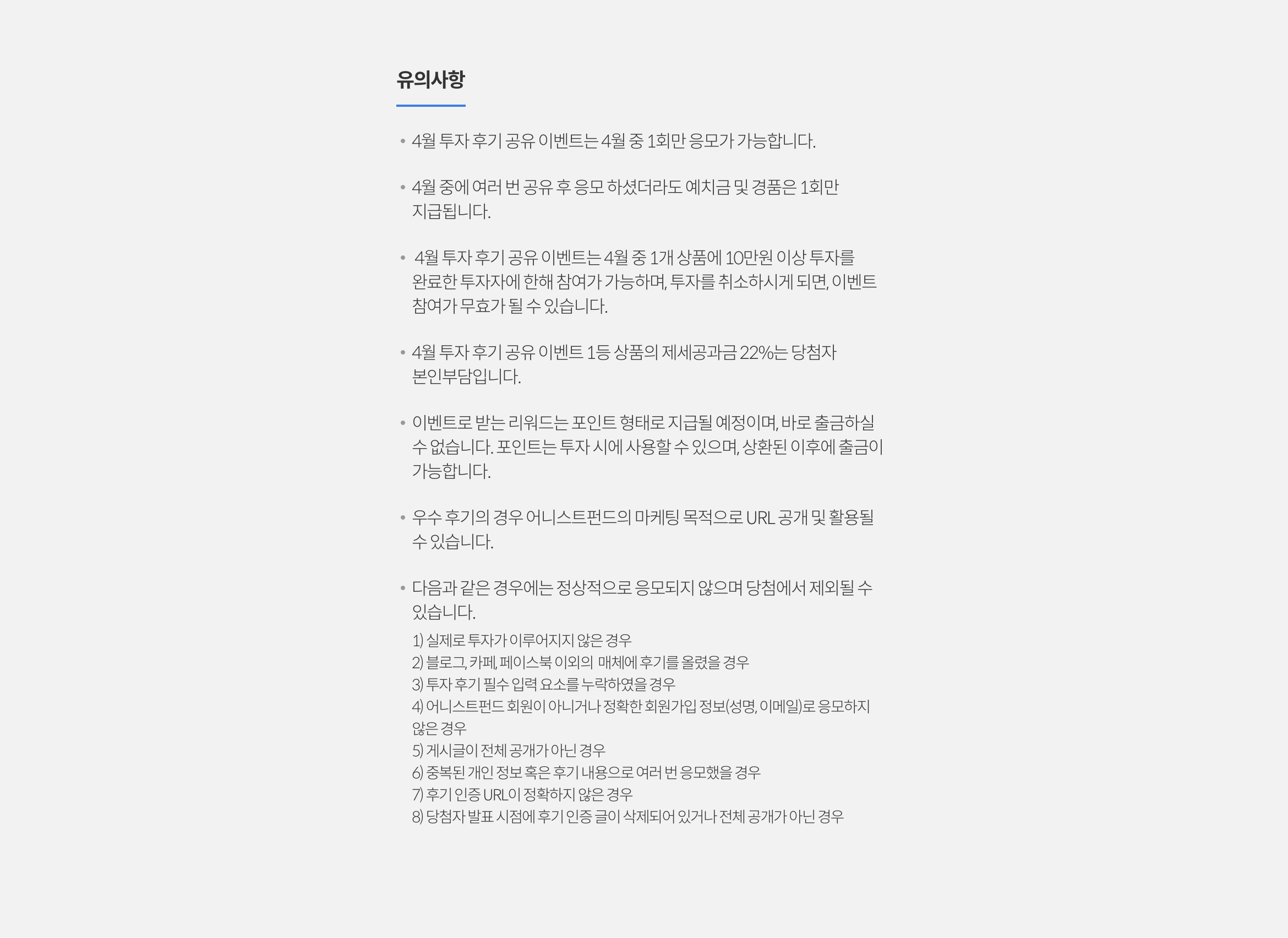 - 4월 투자인증이벤트 참여자 대상 예치금 포인트는 당첨자 발표일 지급될 예정입니다.