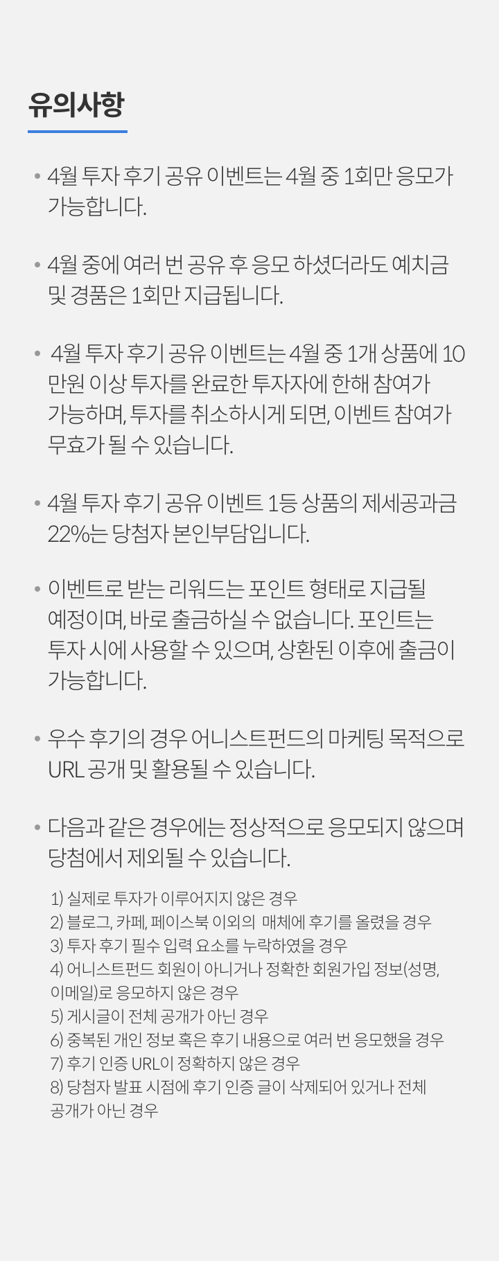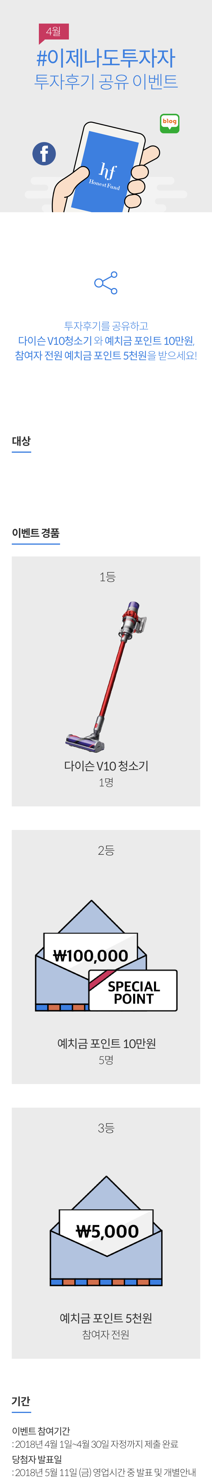 - 4월중 1개 상품에 10만원이상 투자하신 고객에 한하여 참여가 가능하며, 투자를 취소하시게 되면, 이벤트 참여가 무효가 될 수 있습니다.