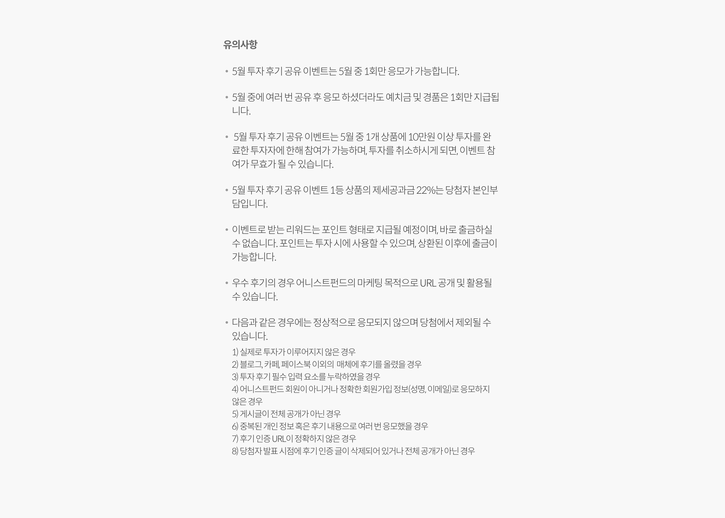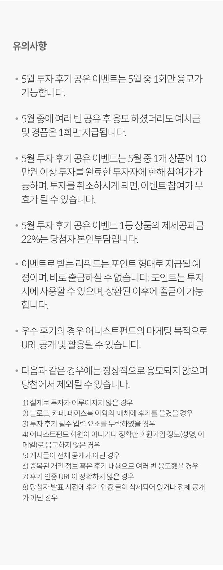 소중한 의견에 깊은 감사를 드리며 5월 투자후기 인증이벤트에도 많은 관심 부탁드립니다.