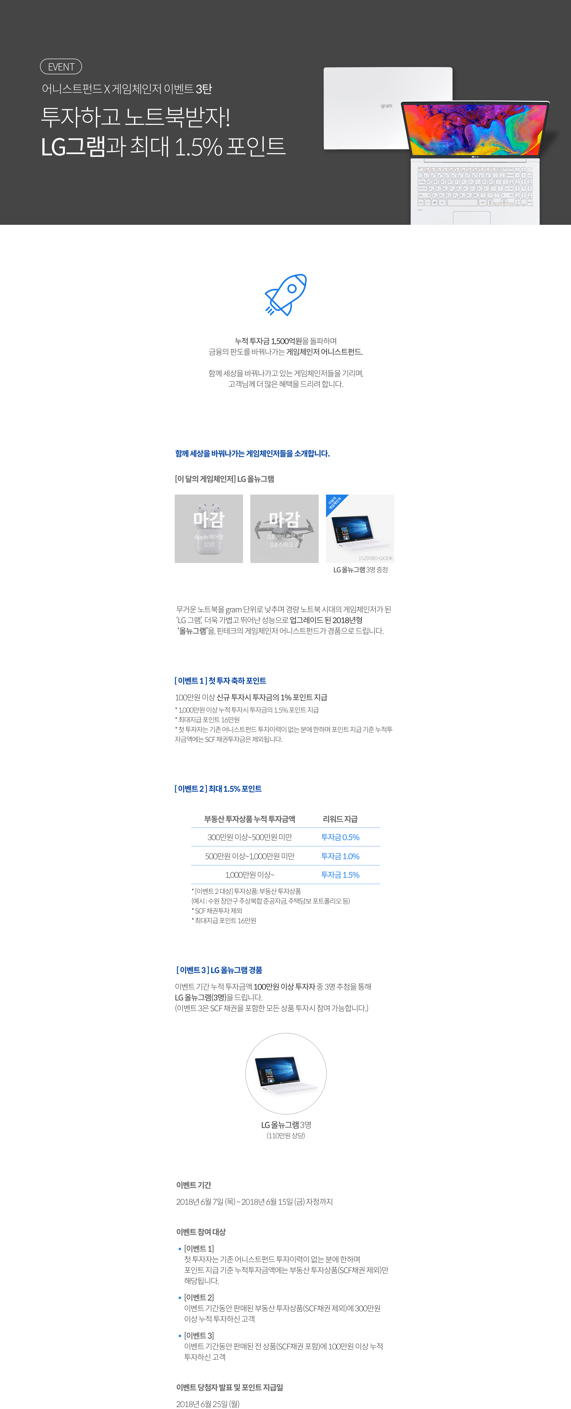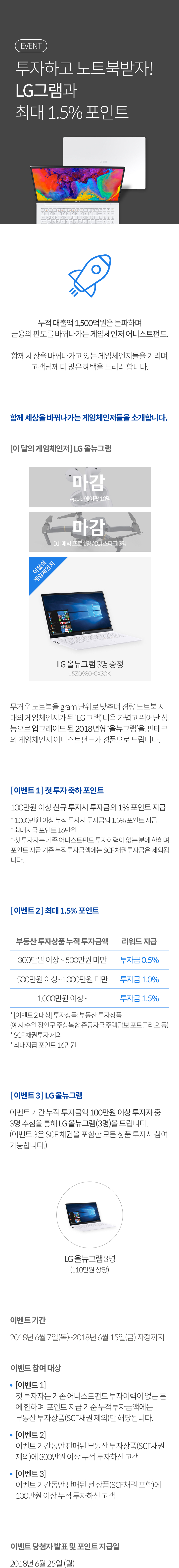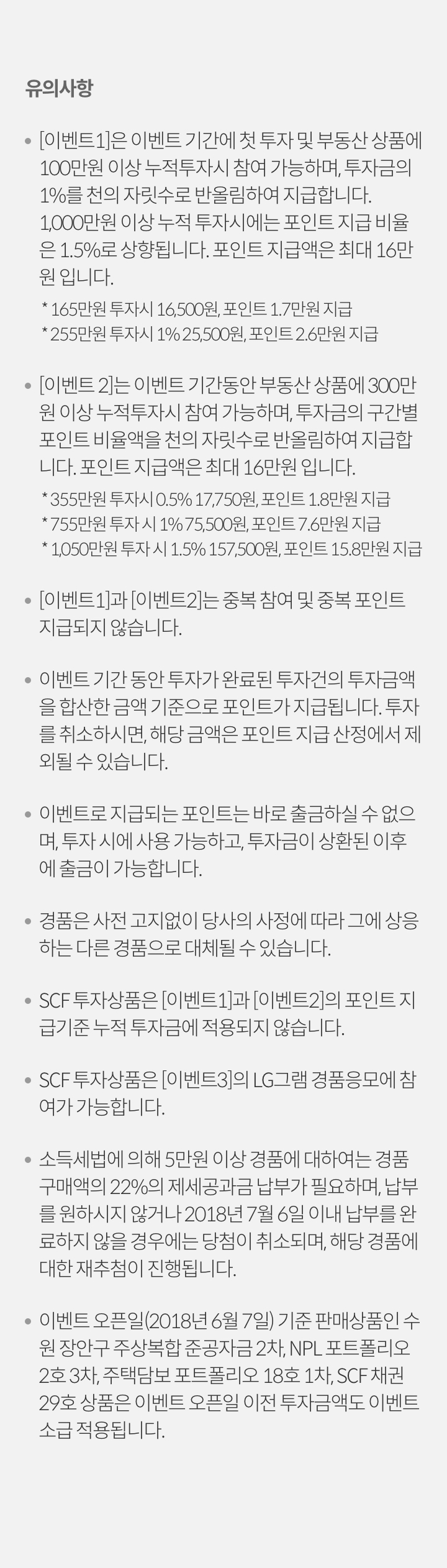 - 이벤트 오픈일(2018년 6월 7일) 기준 판매중이었던 상품인 수원 장안구 주상복합 준공자금 2차, NPL 포트포리오 2호 3차, 주택담보 포트폴리오 18호 1차, SCF 채권 29호 상품은 이벤트 오픈일 이전 투자금액도 이벤트 소급 적용됩니다.