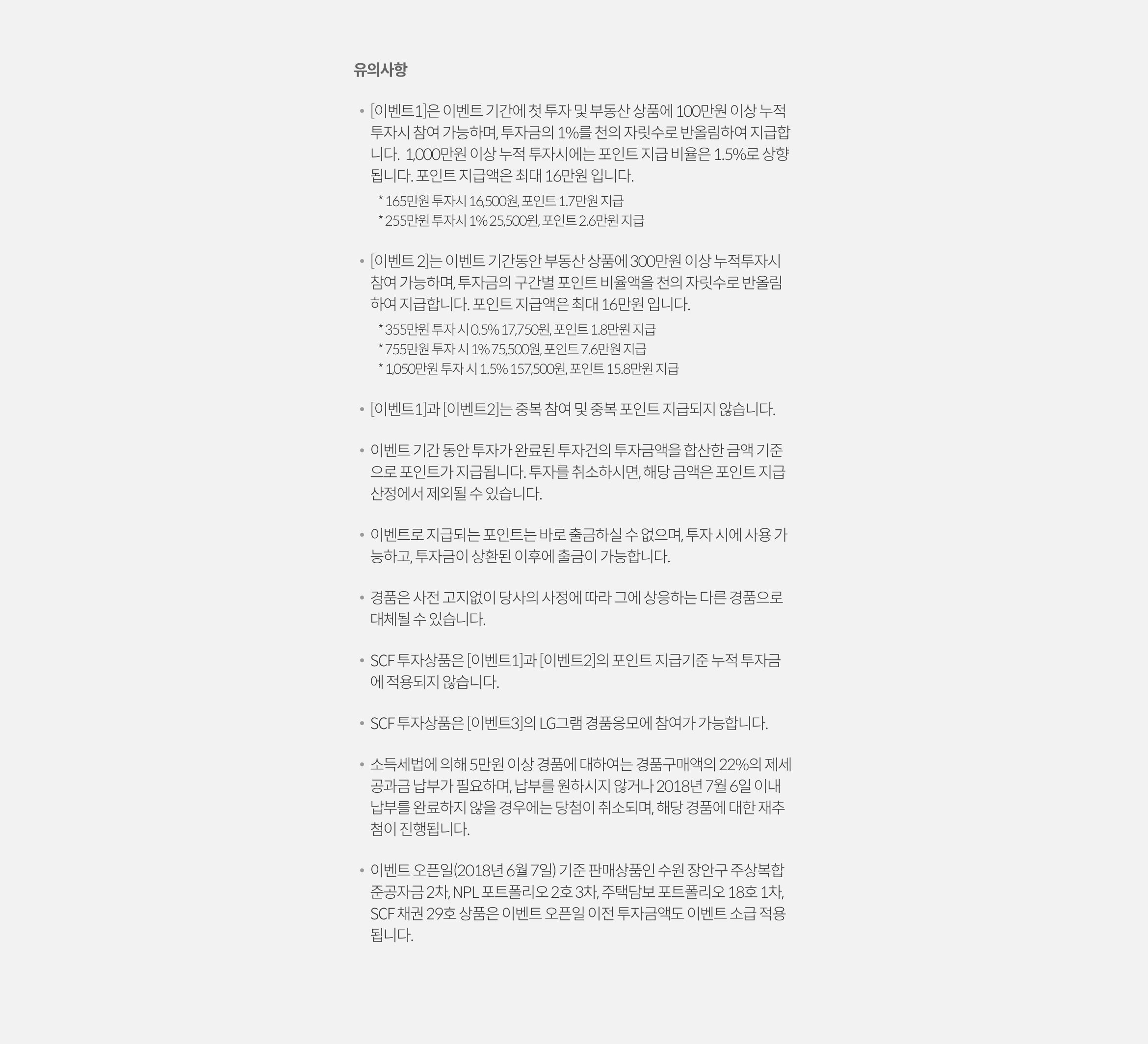 - SCF 투자상품은 본 이벤트의 부동산 투자상품에 해당되지 않으며 이벤트의 누적 투자금에 적용되지 않으며, 경품응모 참여가 가능합니다.