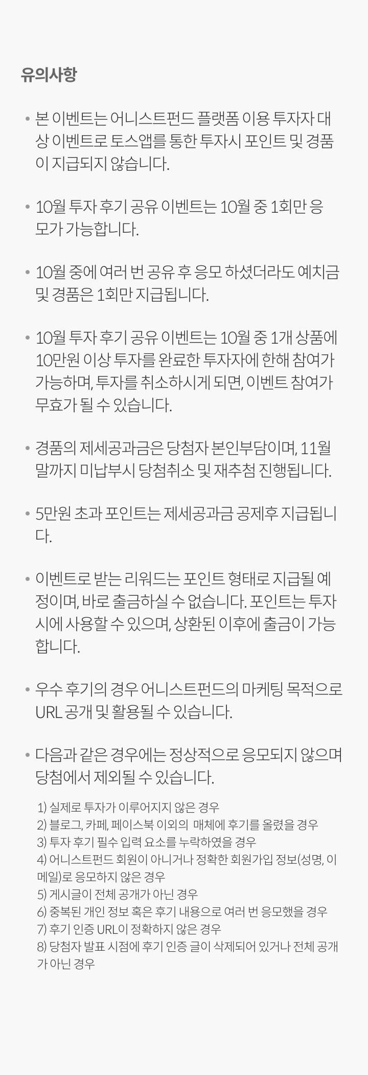 - 10월중 1개 상품에 10만원이상 어니스트펀드 플랫폼에서 투자하신 고객에 한하여 참여가 가능하며, 투자를 취소하시게 되면, 이벤트 참여가 무효가 될 수 있습니다.