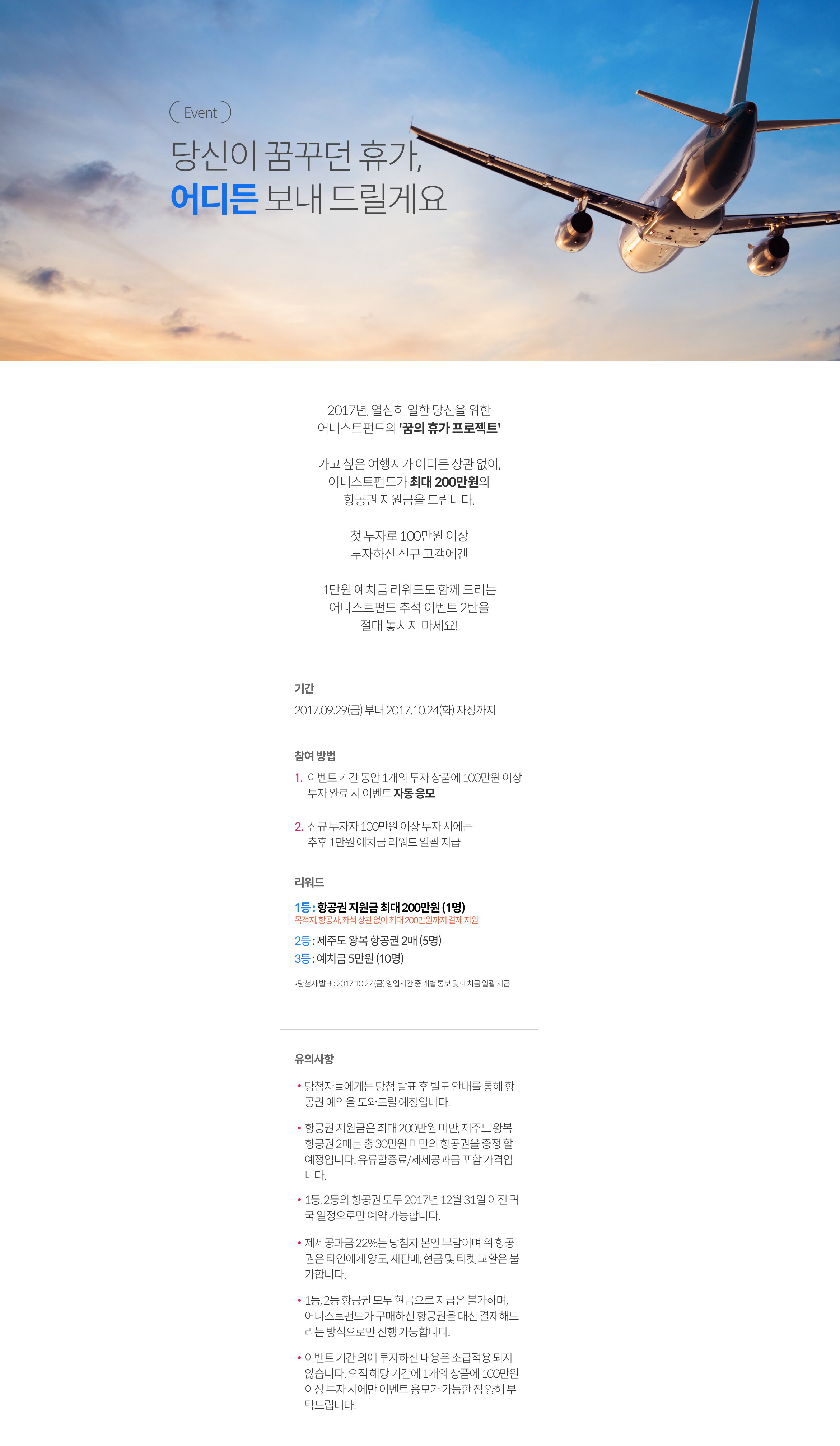 - 당첨자들에게는 당첨 발표 후 별도 안내를 통해 항공권 예약을 도와드릴 예정입니다.- 항공권 지원금은 최대 200만원 미만, 제주도 왕복 항공권 2매는 총 30만원 미만의 항공권을 증정할 예정입니다. 유류할증료/제세공과금 포함 가격입니다.