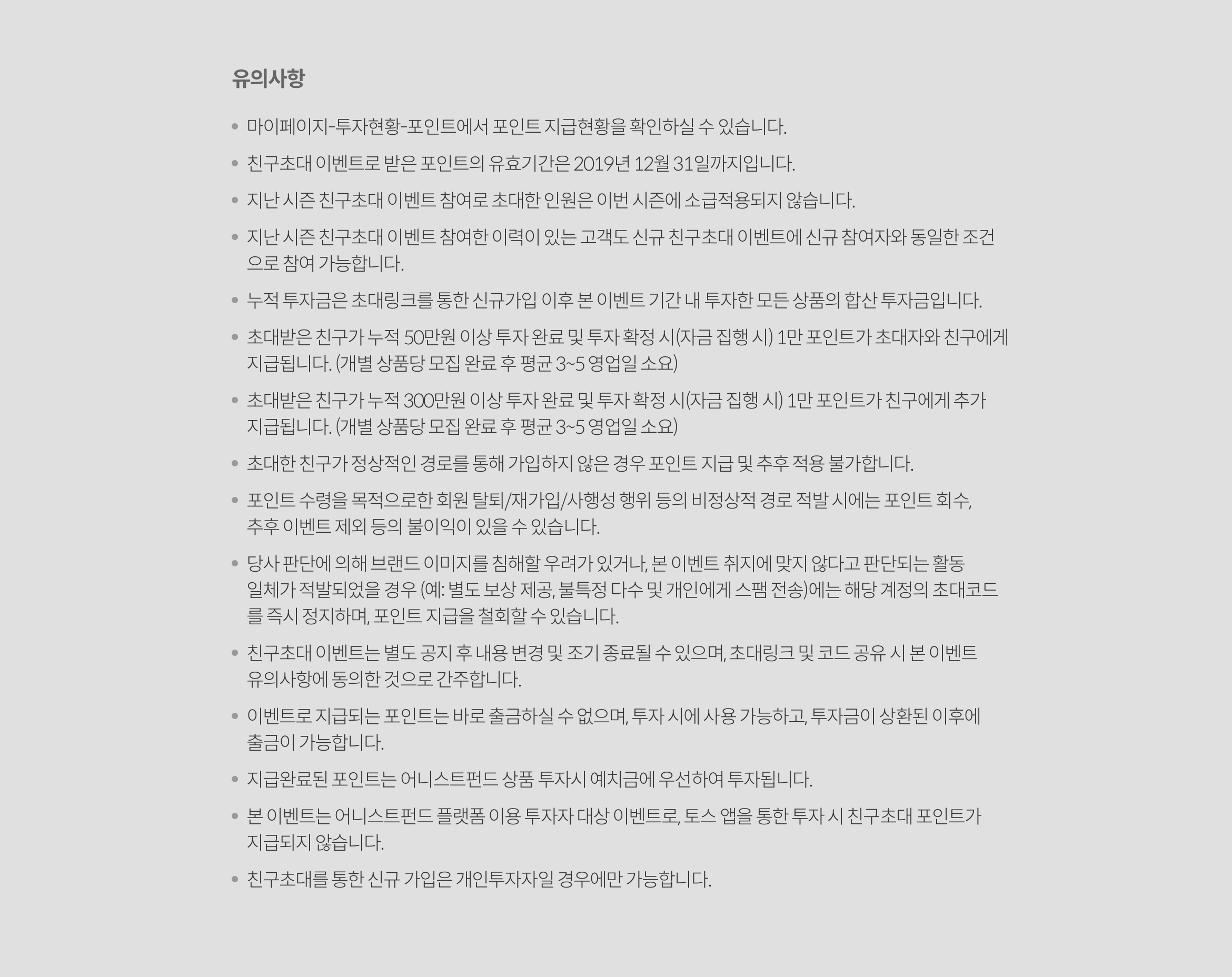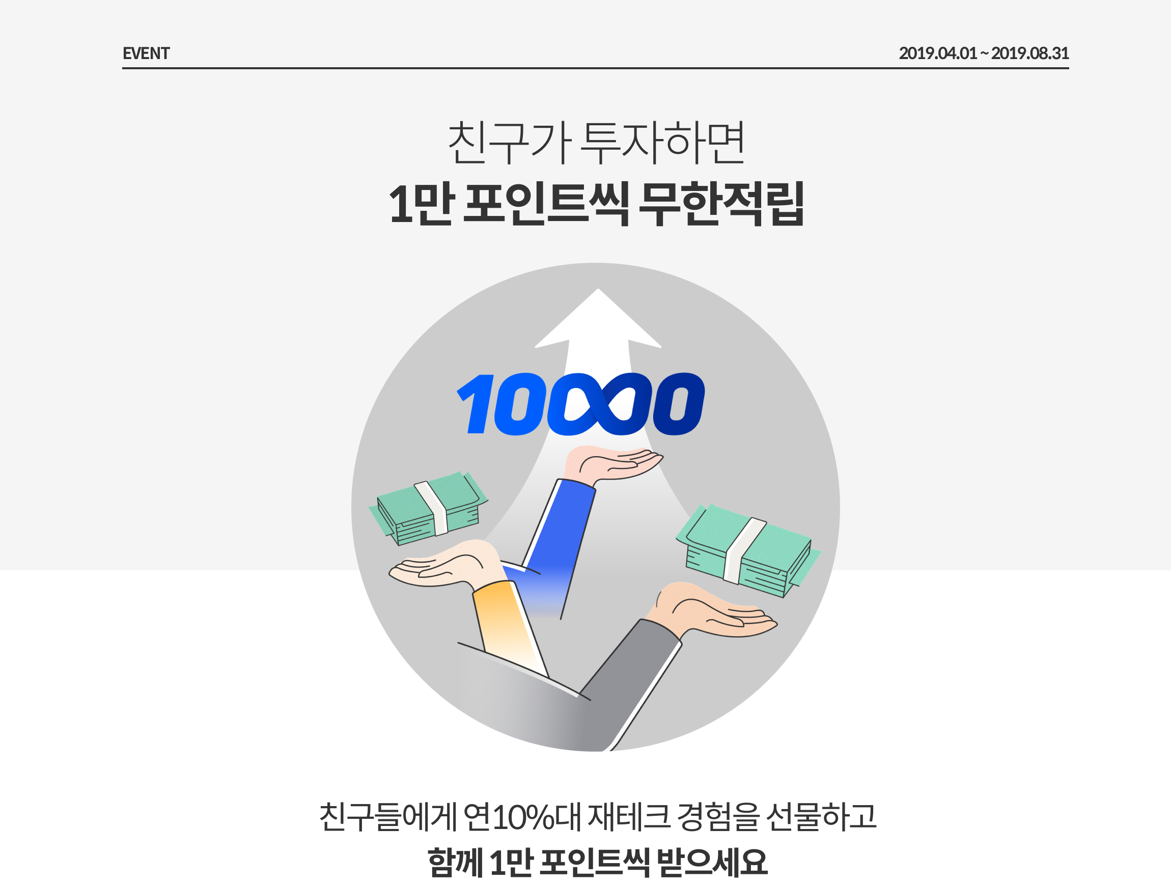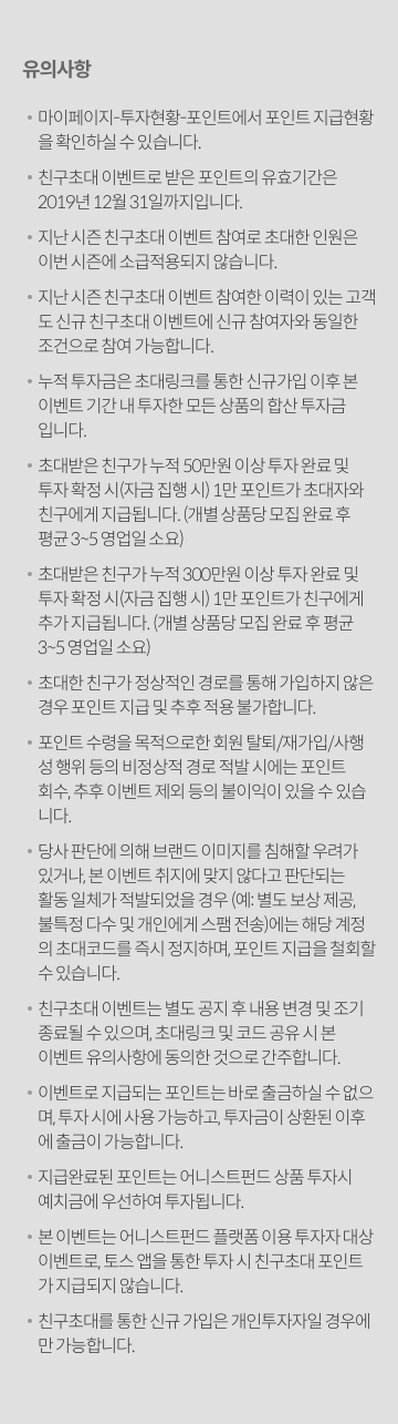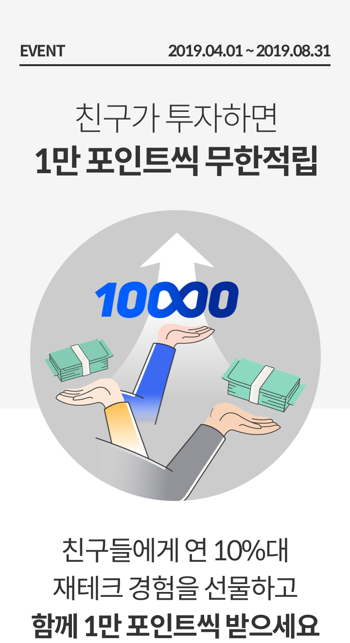 이벤트 친구초대 이벤트 시즌5 2019.04.01 ~ 2019.08.31 친구에게 초대장 공유하기 친구에게 초대장 공유하기 친구에게 초대장 공유하기 친구에게 초대장 공유하기 다음 5월 #이제나도투자자 투자후기 공유 이벤트 당첨자 발표 2019.05.01 ~ 2019.05.31 이전 4월 #이제나도투자자 투자후기 공유 이벤트 당첨자 발표 2019.04.01 ~ 2019.04.30 목록 이벤트가 종료되었습니다. 확인
