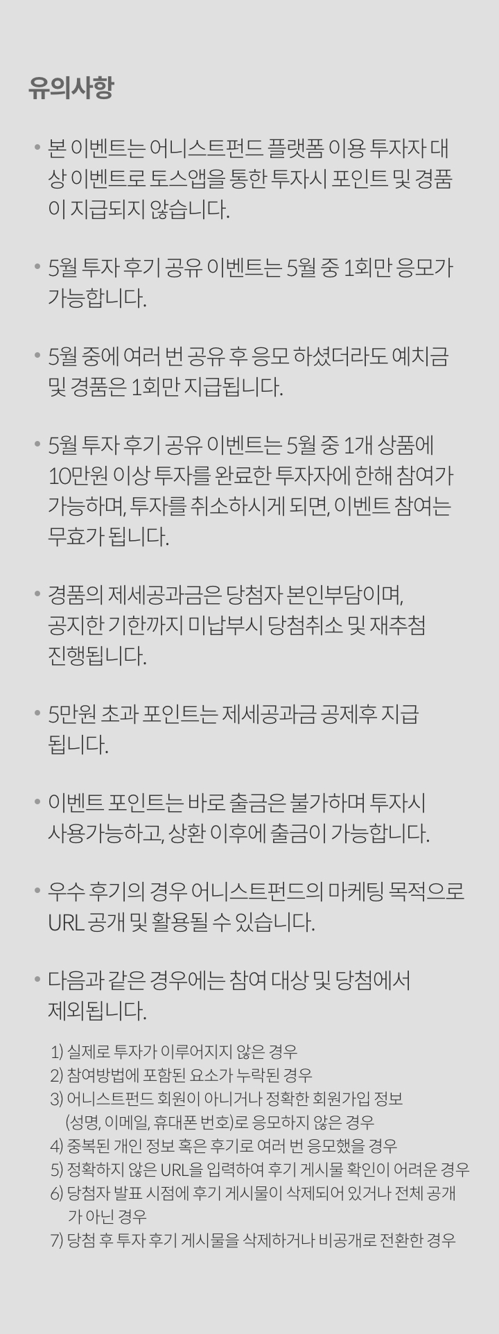 - 5월 중 1개 상품에 10만원 이상 어니스트펀드 플랫폼에서 투자하신 고객에 한하여 참여 가능하며, 투자를 취소하시게 되면 이벤트 참여는 무효가 됩니다.