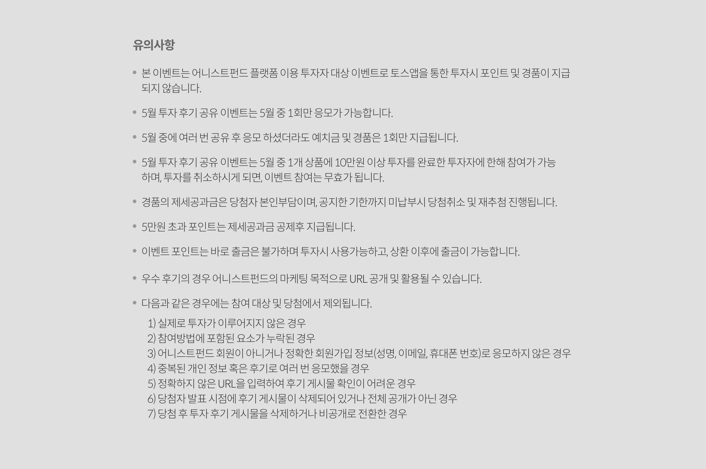 3) 어니스트펀드 회원이 아니거나 정확한 어니스트펀드 회원가입 정보(성명, 이메일, 휴대폰번호)로 응모하지 않은 경우