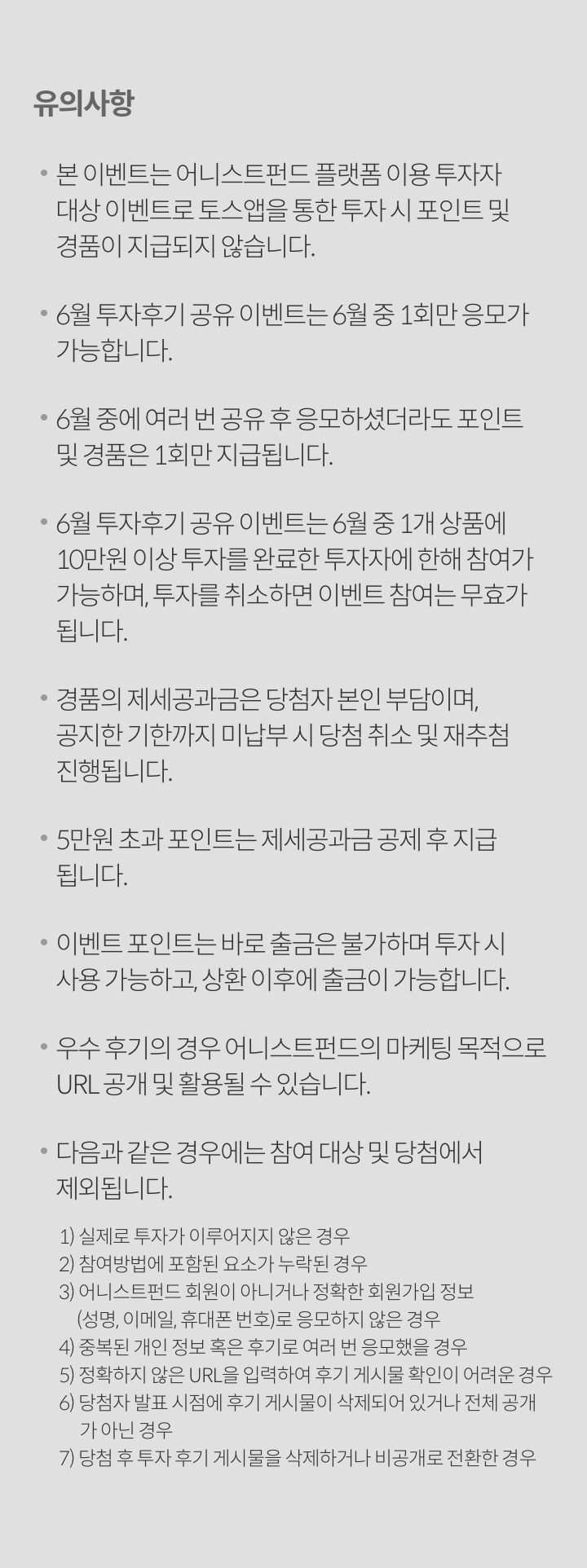 3) 어니스트펀드 회원이 아니거나 정확한 어니스트펀드 회원가입 정보(성명, 이메일, 휴대폰번호)로 응모하지 않은 경우